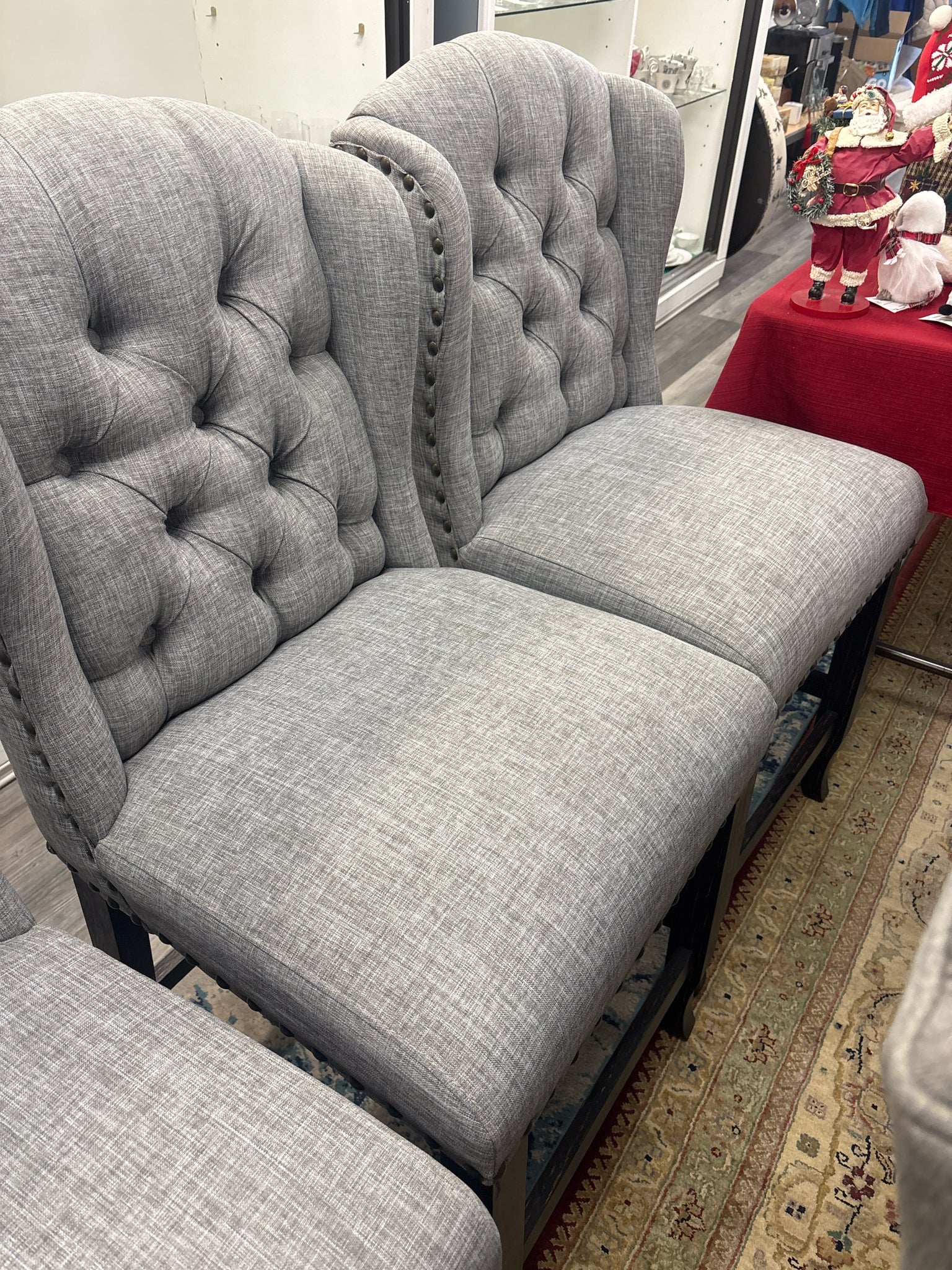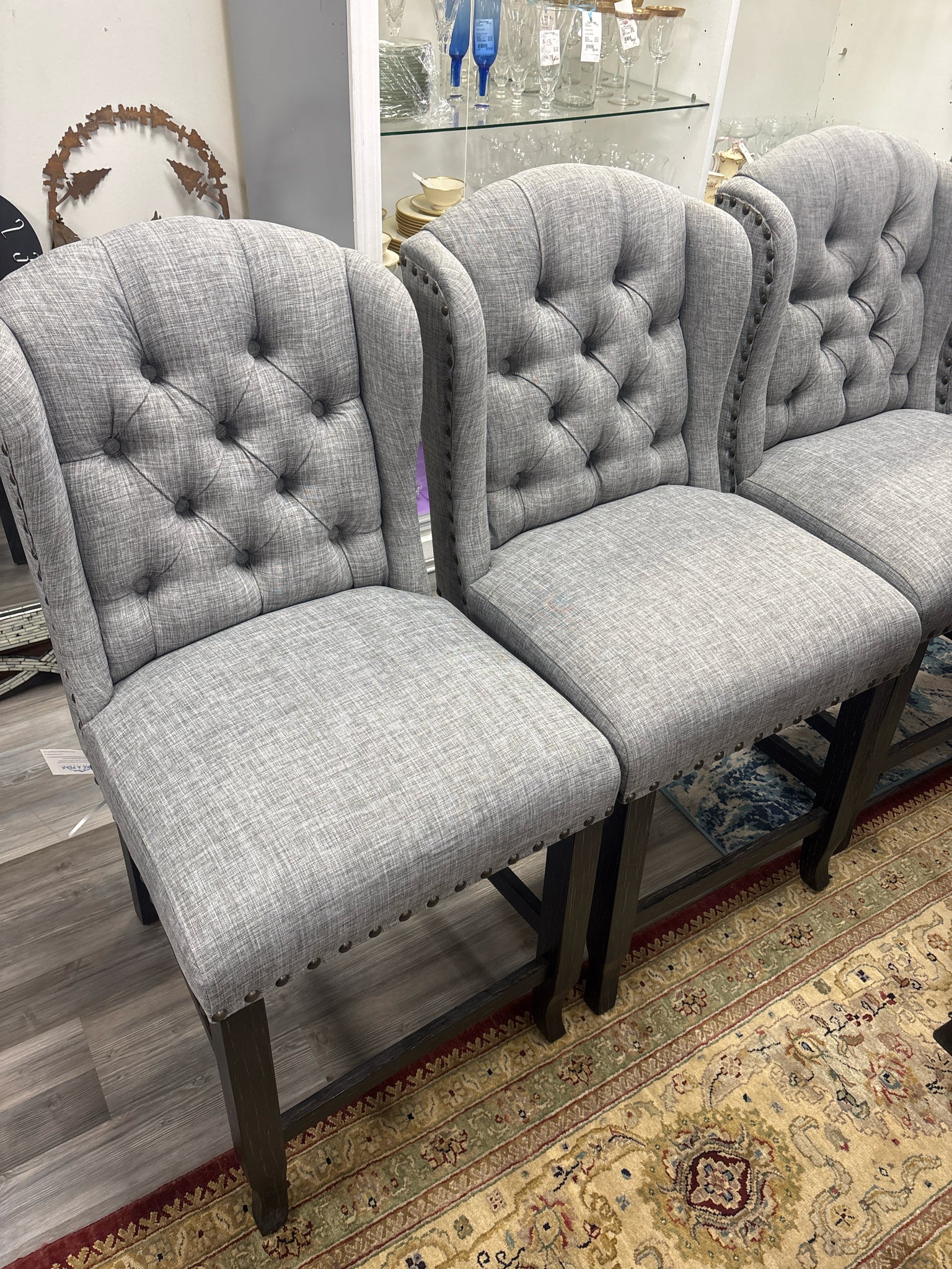 PAIR GREY TUFTED COUNTER STOOLS
